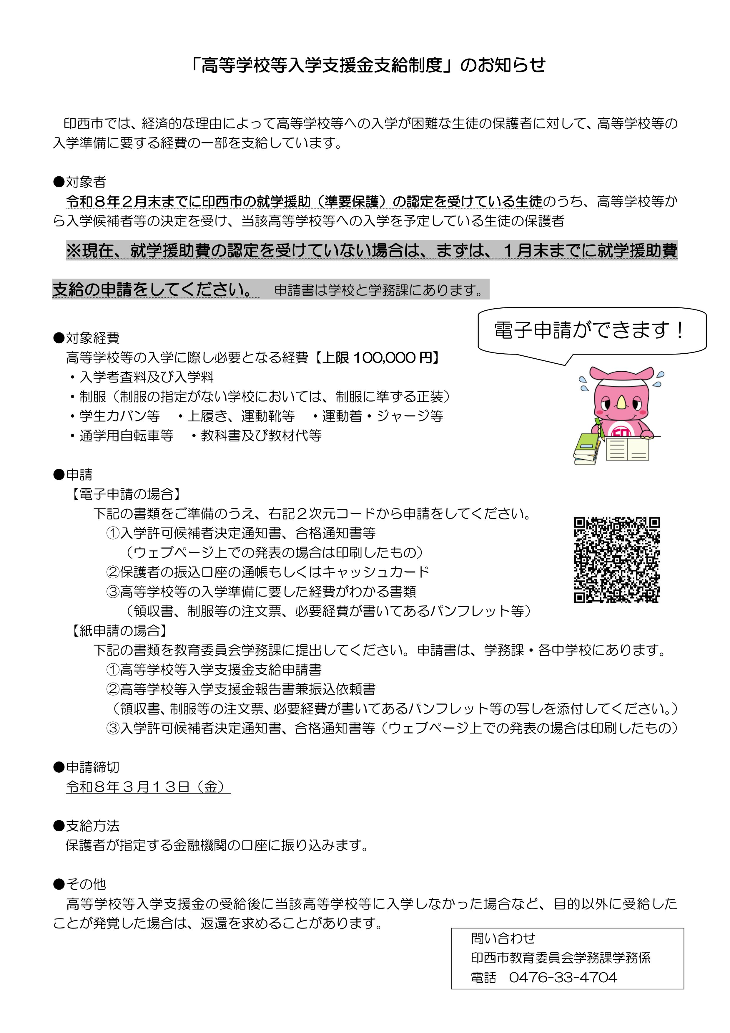 学校からのお知らせ>教育委員会等からのおたより2025後半(←ここをクリック)のページに、155-1.印西市高校入学支援金お知らせチラシ.jpg155-2.高等学校等入学支援金支給申請書.doc155-3.高等学校等入学支援金報告書兼振込依頼書(記入例).pdf156.冬休み前保護者向けオンライン講演チラシ.pdf等をアップしました。クリックしてご確認ください。